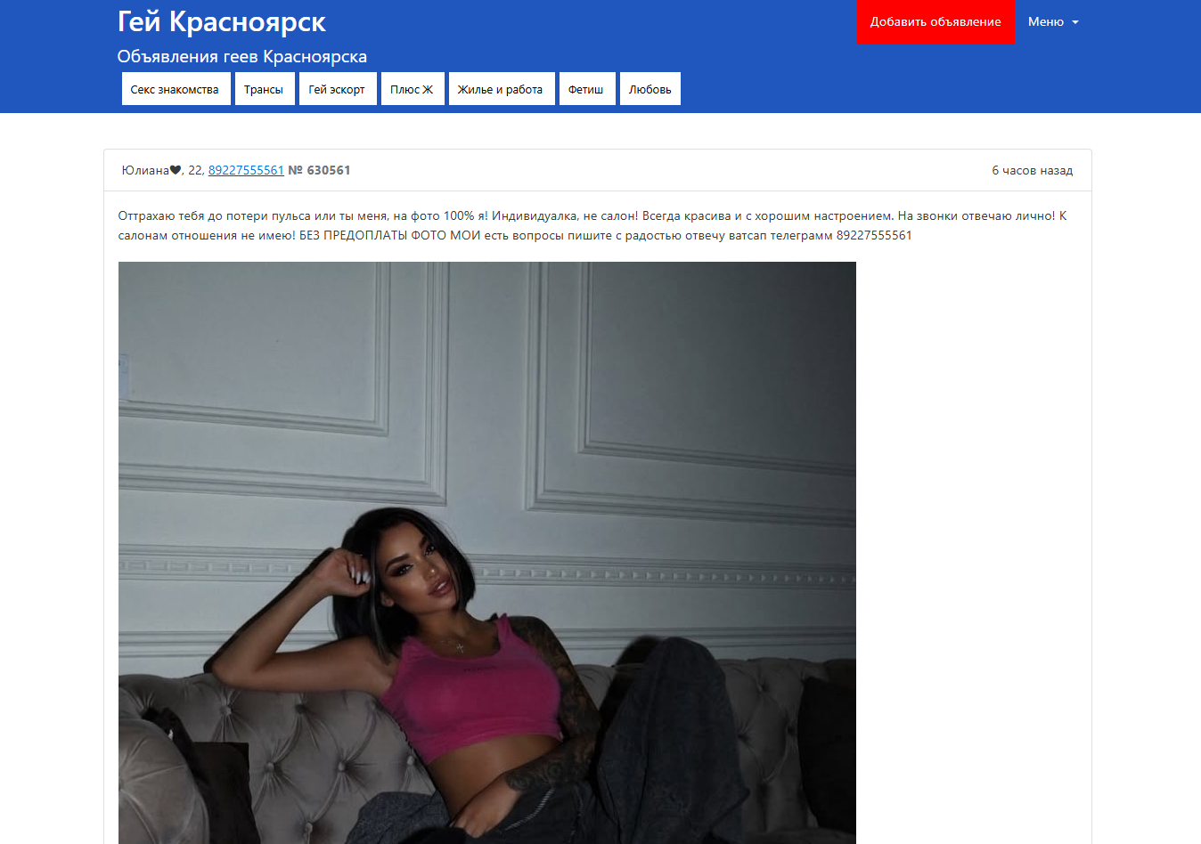 Оттрахаю тебя до потери пульса или ты меня, на фото 100% я! Индивидуалка, не салон! Всегда красива и с хорошим настроением. На звонки отвечаю лично! К салонам отношения не имею! БЕЗ ПРЕДОПЛАТЫ ФОТО МОИ есть вопросы пишите с радостью отвечу ватсап телеграмм 89227555561